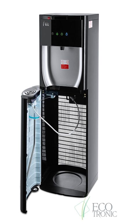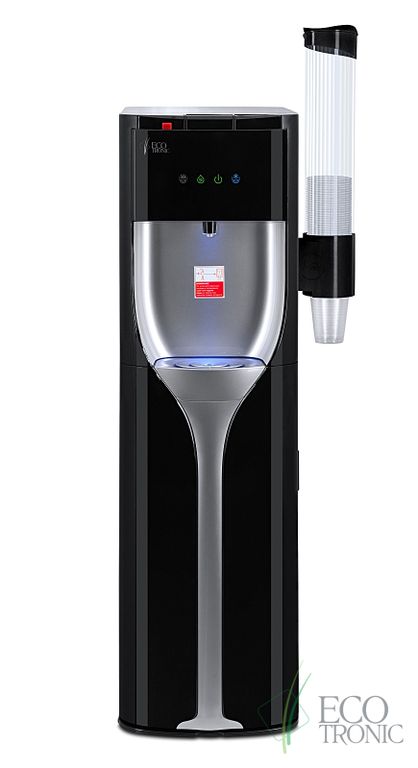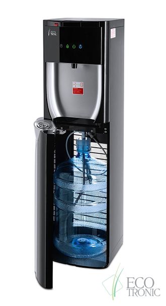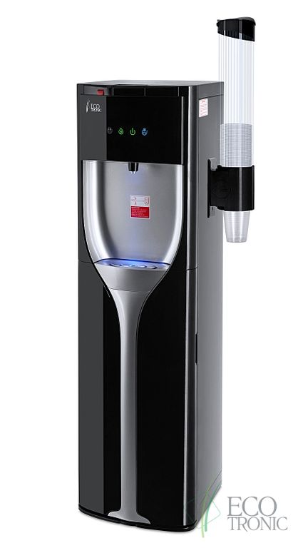 Кулер с компрессорным охлаждением и нижней загрузкой бутыли. В зоне подачи воды есть подсветка. Кран подачи воды один, управление осуществляется с помощью трех клавиш сверху: для горячей воды, холодной и комнатной