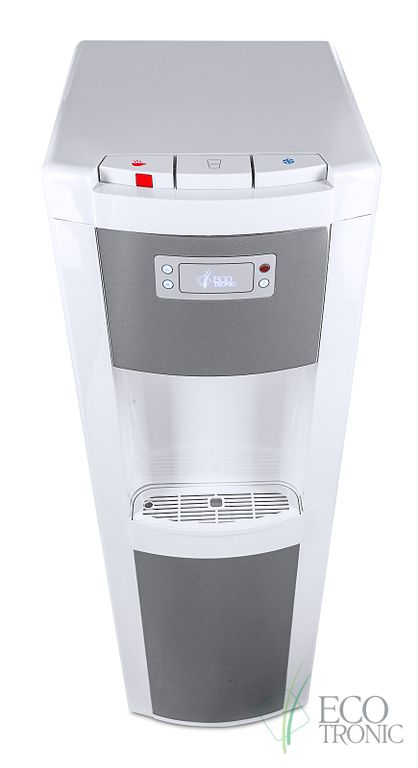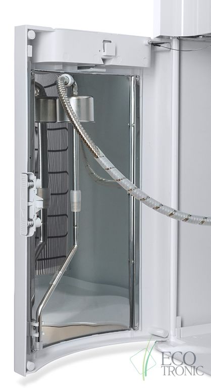 Ecotronic P9-LX Black – кулер с нижней загрузкой бутыли. Специальная изогнутая, регулируемая по длине заборная трубка позволяет производить забор воды из бутыли без остатка. Три крана подачи воды: горячая, прохладная и холодная. Лоток со встроенным поплавком, сигнализирующим о заполнении. Закачка воды в систему кулера происходит с помощью водной помпы. Выкатная полка отсутствует. Кран горячей воды с опциональной защитой от детей: чтобы ее подключить, свяжитесь с нашим сервисным центром