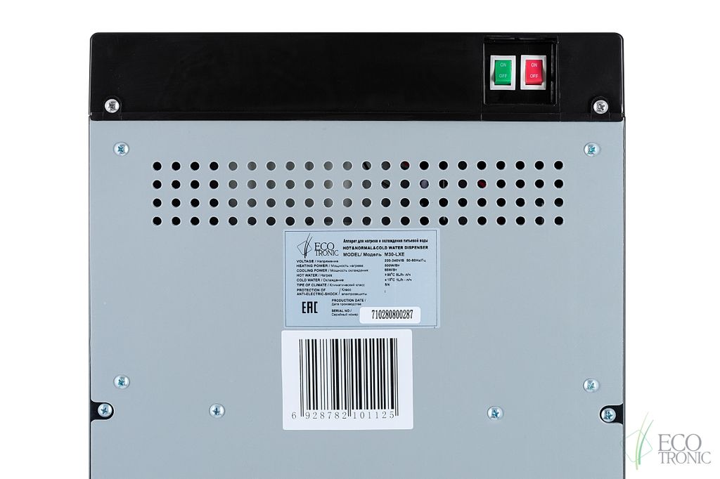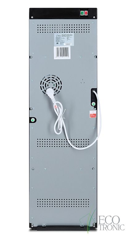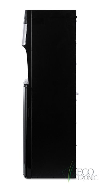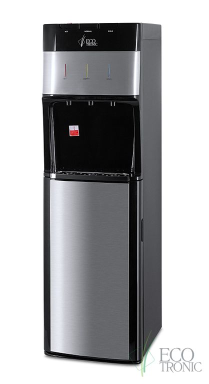 Кулер с нижней загрузкой бутыли и электронным охлаждением. Корпус черного цвета с серебристой вставкой. 3 клавиши подачи воды (горячая/комнатной температуры/холодная). Клавиша горячей воды с защитой от детей. Индикация режимов нагрева, охлаждения воды, а также индикация отсутствия воды в бутыли. Для быстрой очистки краников применяются съемные гигиенические колпачки. Выключатели нагрева и охлаждения воды.